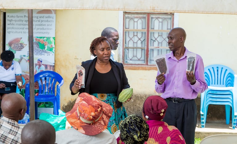 Koko Agri Farms is dedicated to championing Ugandan Cocoa Bean Farmers by organizing agricultural education along with business development resources to improve agricultural practices, increase yields and the quality of marketable products, while expanding market access. Farmers gain bargaining power when they organize their efforts into smallholder farmer associations, agricultural cooperatives or farm aggregates that aim to collectively address challenges such as access to resources, market competition, and sustainable farming practices.